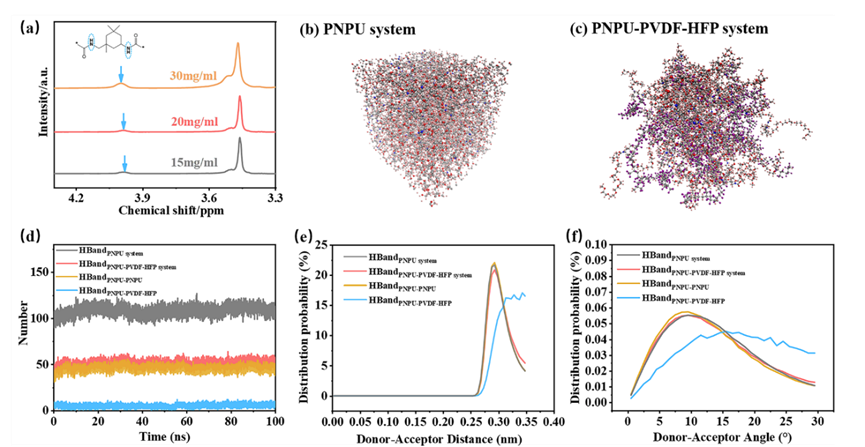 通过测试分析以及模拟计算验证PNPU中含有多重氢键模式,并且随着PNPU引入PVDF-HFP中,PNPU-PVDF-HFP聚合物体系中维持原有多重氢键模式。