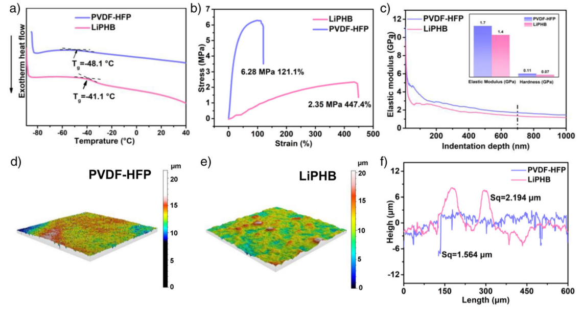 该研究提出了一种具有对称交叉结构的硼离子中心锂盐LiT4PAB作为单元,并通过与PVDF-HFP的三维化学交联构建了鲁棒-自适应框架LiPHB SICPEs。由单键连接的LiT4PAB表现出丰富的构象转变,同时在BBI的静电相互作用促进下,三维结构的LiPHB在受到冲击时能够发生自适应变形,通过能量耗散实现良好的机械延展性,拉伸强度为2.35 MPa,弹性模量为1.4 GPa,最大伸长率为447.4%。LiPHB不仅表现出高锂离子迁移数(tLi⁺=0.7)和30 °C下5.9×10⁻⁴ S cm⁻¹的离子电导率,还具有高达358.3 °C的热稳定性和宽电化学稳定窗口(在NCM811电池中为4.6 V)。此外,PVDF-HFP中丰富的氟元素在循环过程中有助于形成富含LiF的固体电解质界面(SEI)层。因此,锂-锂对称电池在0.1 mA cm⁻²下能够稳定循环超过1500小时,在0.2 mA cm⁻²下循环200小时,临界电流密度(CCD)高达1 mA cm⁻²。重要的是,即使在苛刻条件下,铜箔上初始锂沉积的成核过电位仅为26.5 mV,库仑效率为87.1%,揭示了LiPHB SICPEs的机械-电化学耦合界面稳定性。同时,Li/LiPHB SICPEs/NCM811固态电池在30 °C和0.2 C电流密度下循环150次后,可逆容量为140 mAh g⁻¹,容量保持率为90.3%。硼基SICPEs能够适应电池循环过程中的显著体积变化,并表现出优异的电化学稳定性。该工作为开发用于高能量密度固态电池的三维结构自适应SICPEs提供了新范式。