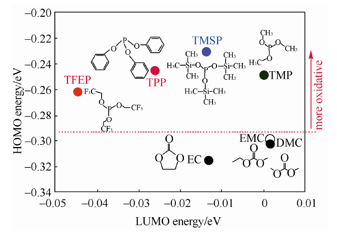 因此,通过计算添加剂分子与溶剂分子的前线轨道能量,可以从理论上判断添加剂的可行性。SONG 等利用Gaussian 09 程序,采用密度泛函理论(DFT) 在 B3LYP/6-311+(3df,2p) 水平下分别对三(2,2,2-三氟乙基)亚磷酸酯 (TFEP) 、三苯基亚磷酸酯 (TPP) 、三(三甲基硅基)亚磷酸酯(TMSP) 以及亚磷酸三甲酯(TMP) 类添加剂以及溶剂分子进行优化,得到相应的优势构象,并对其进行了前线轨道分析。下图可以看出,这些亚磷酸酯化合物的 HOMO 能量远高于溶剂分子,表明亚磷酸酯类化合物比溶剂分子具有更高的氧化性,在正极表面能优先发生电化学氧化,形成SEI膜覆盖在正极表面。