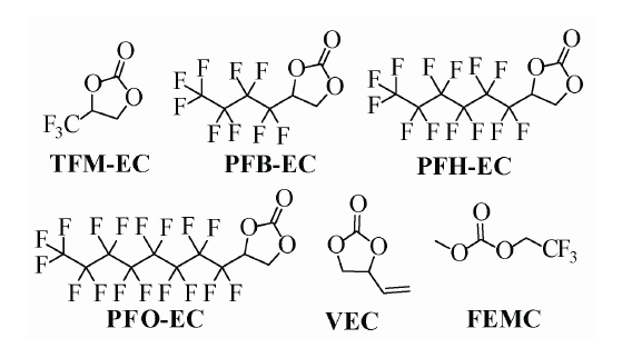 含氟皖基 (PFA) 化合物具有很高的电化学稳定性,同时具备疏水性与疏油性的特性,当 PFA 添加到有机溶剂中,疏溶剂的PFA会凝聚到一起形成胶团。由于PFA的这一特性,ZHU等尝试将全氟烃基(下图中TEM-EC、PFB-EC、PFH-EC 、PFO-EC)取代的碳酸亚乙酯添加到高压锂离子电池电解液中,对于Li 1.2Ni0.15Mn0.55Co0.1O2石墨电池,当加入0.5% (质量分数)的PFO-EC后,电池在长时间循环过程中性能明显提高,这主要是因为添加剂在循环过程中形成了双层的钝化膜,同时减少电极表面的降解与电解液的氧化分解。