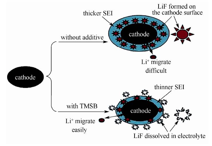 Li等将三(三甲基烷)硼酸酶 (TMSB)应用到以 Li[Li0.2Mn0.54Ni0.13Co0.13]O2 作正极材料的高压锂离子电池中,发现当有0.5%(质量分数)TMSB 添加剂存在时,循环200圈后容量保持74%(电位范围2-4.8 V,充放电倍率为0.5 C),而没有添加剂存在时,容量保持仅为19%[1]。